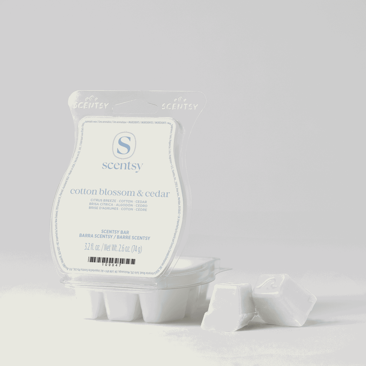 Part of the Classic Collection, the Cotton Blossom & Cedar Scentsy Bar captures that just-washed feeling — sun-warmed cotton on the line, a hint of citrus in the air and the gentle, grounding warmth of cedar lingering underneath.