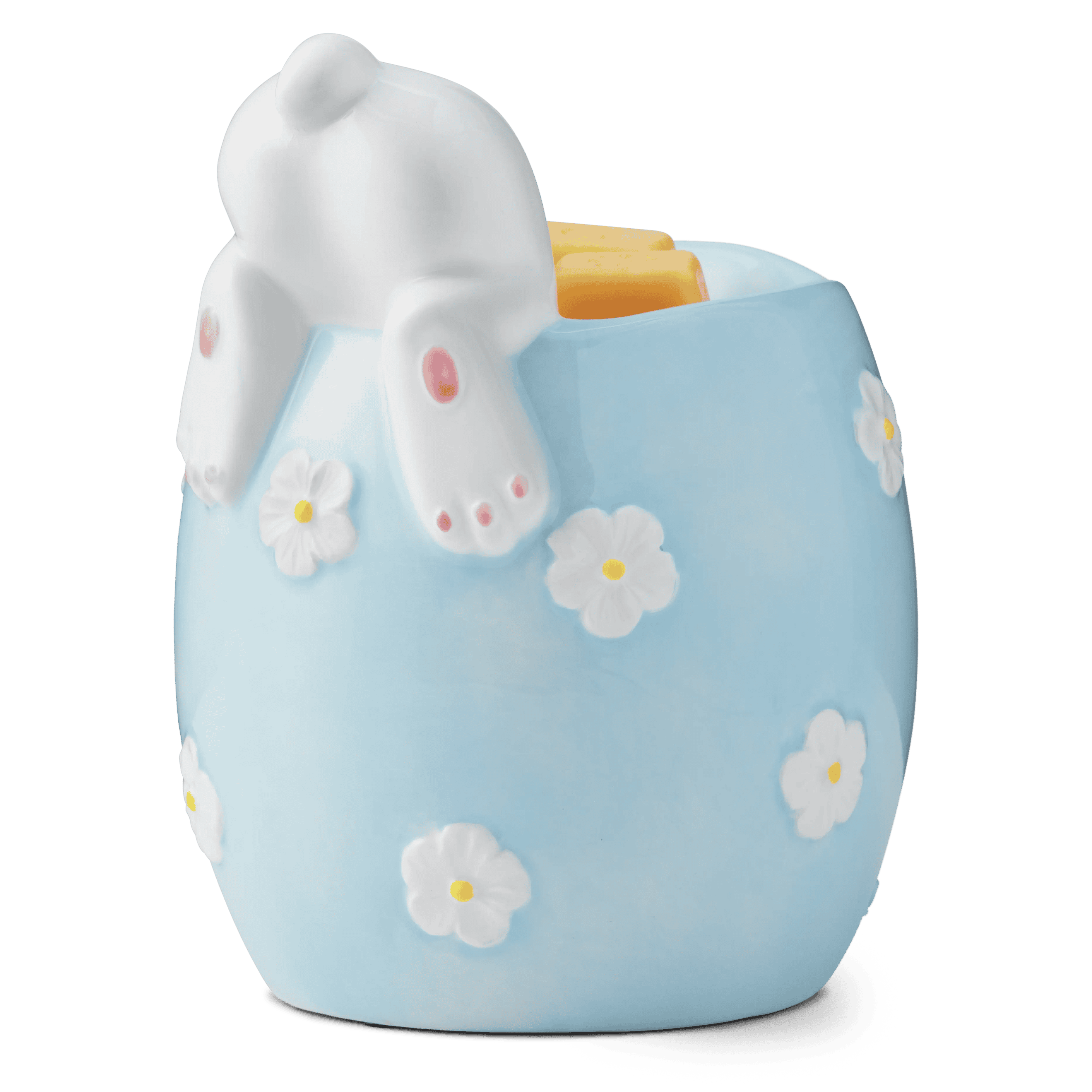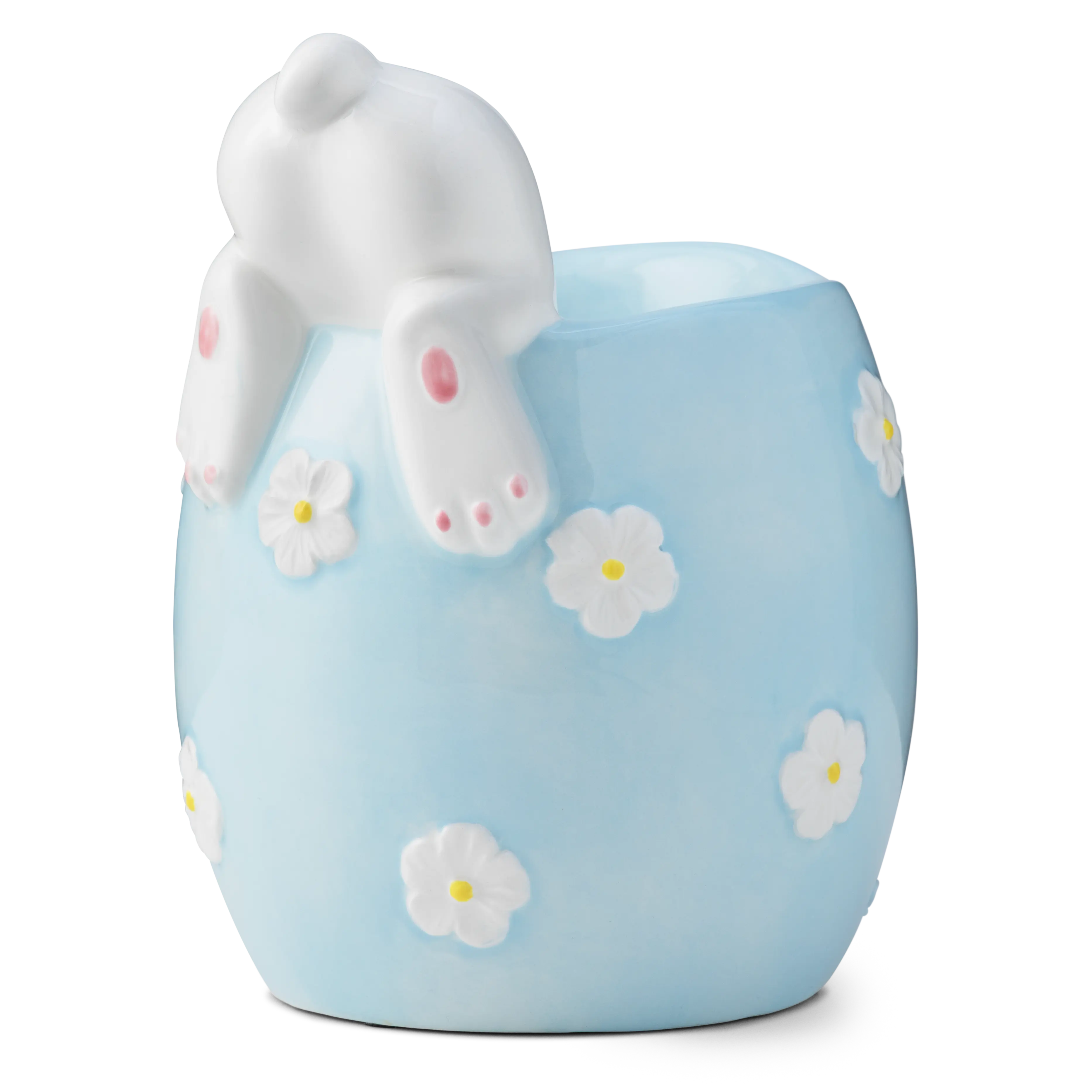 Hop into spring with the Curious Cottontail Scentsy Warmer, a charming, light blue ceramic warmer designed to bring a playful touch to any space! This whimsical piece features an adorable bunny burrowing headfirst into the warmer, with its fluffy tail and little legs sticking out of the top.