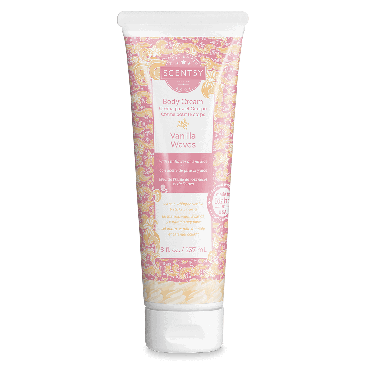 Mega-moisturising, vitamin-packed, and heavenly scented with sweet-salty fragrance, Vanilla Waves Body Cream promises to give you your best skin ever. Part of the Vanilla Waves Scentsy Body range, it hydrates with sunflower oil, protects with aloe, and fragrances with the inimitable aromas of whipped vanilla cream, sticky caramel, and sea salt.