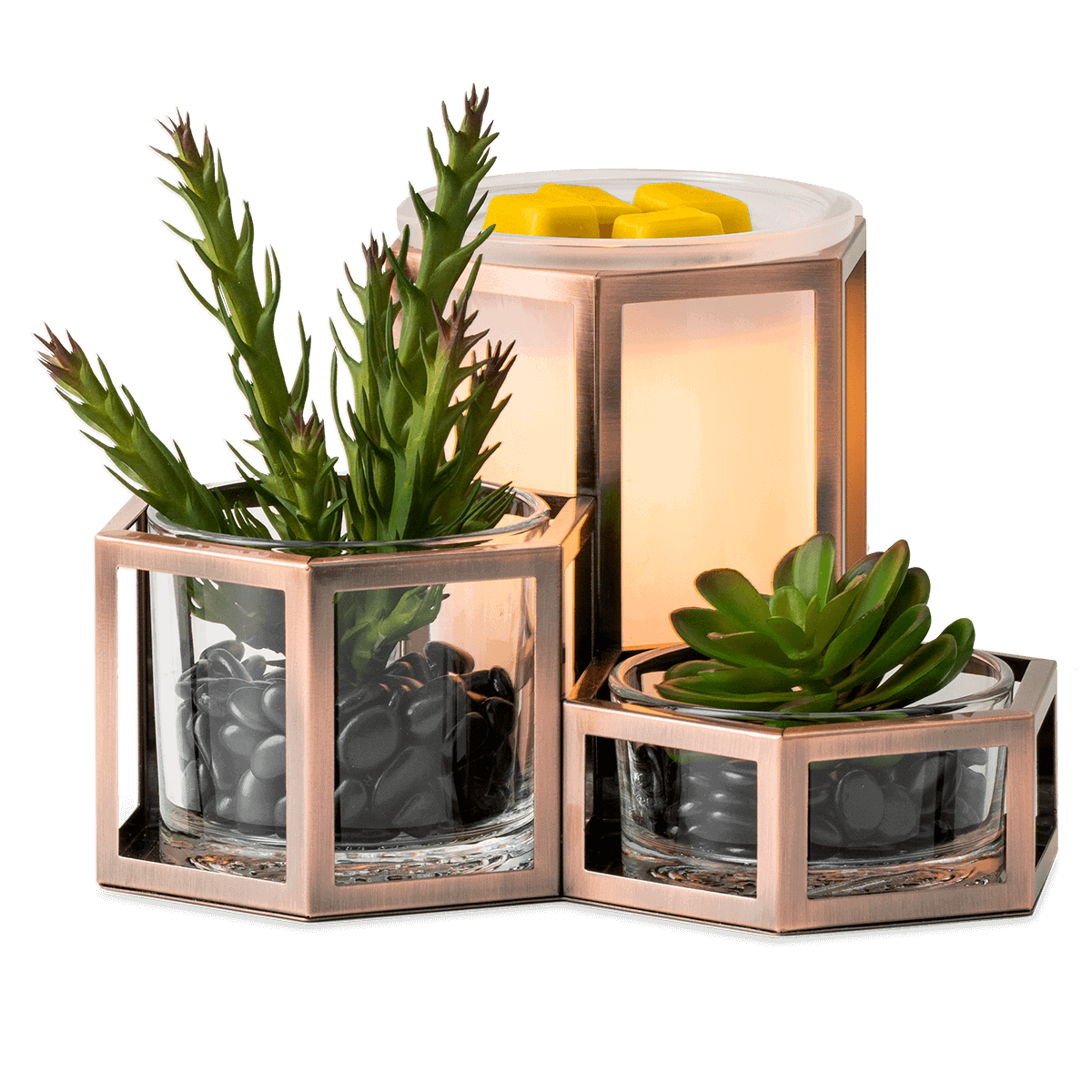 The Wild Desert Scentsy Warmer includes three hexagonal pieces linked together to create the perfect display. Stylish metal detailing gives it a modern and trendy feel, while faux desert succulents promise to bring a touch of the wild west to any desktop, bathroom, or family living space. A gorgeous glass wax tray adds the finishing touch to this limited edition Scentsy Warmer. Grab yours today!